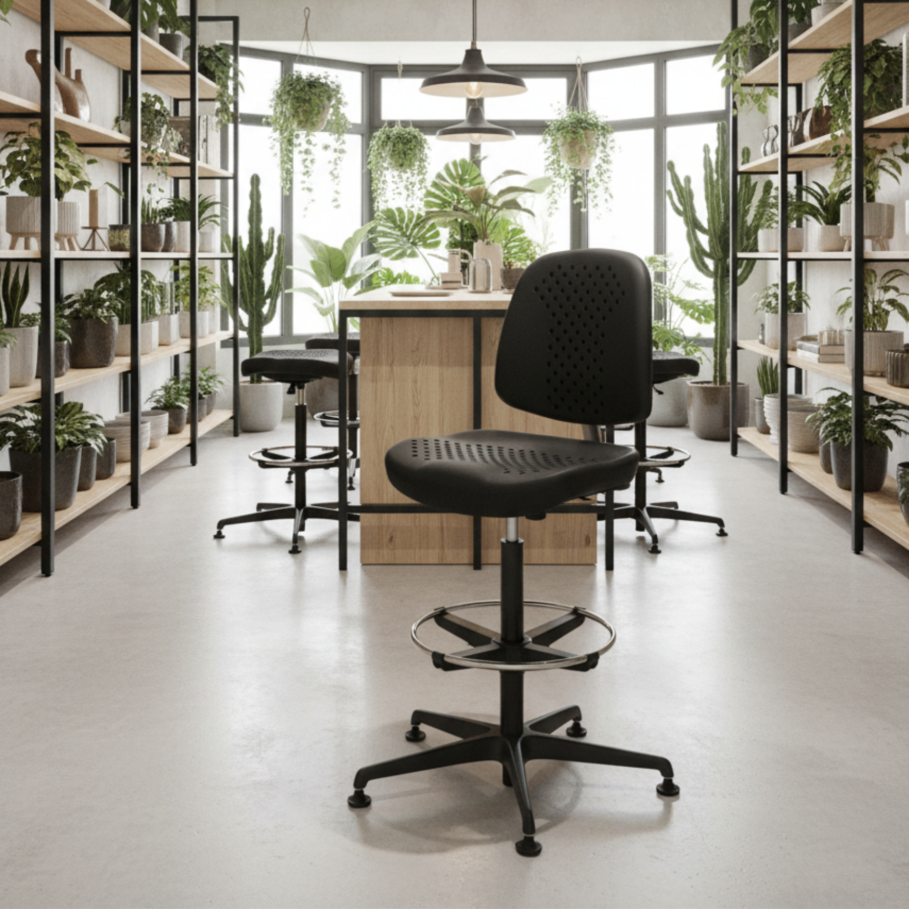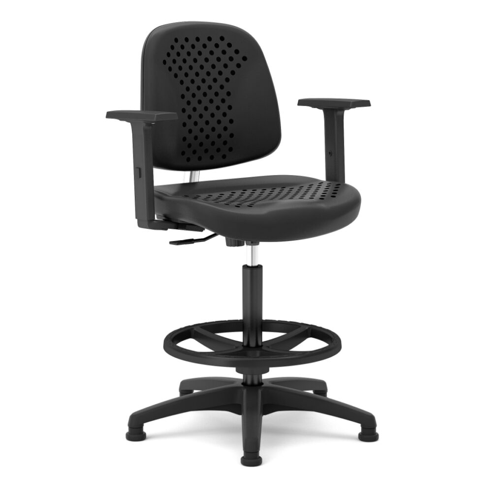 OUTY est un siège d’atelier en polyuréthane soft noir, fonctionnel, giratoire, réglable en hauteur avec repose-pieds