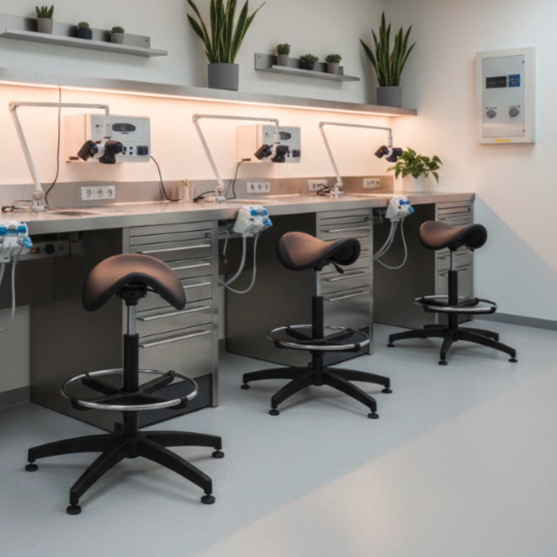 SANO-D est un tabouret, assis debout, en polyuréthane (PU), noir, assise relevable, ajustable, base 5 branches