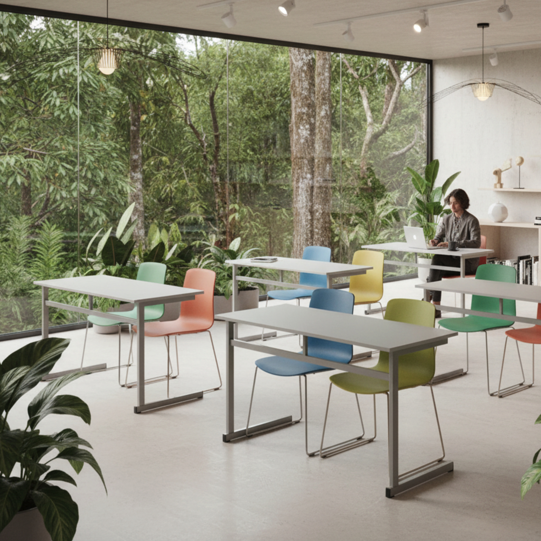 SOLO est une table individuelle ou 2 places, plateau en mélamine, structure époxy