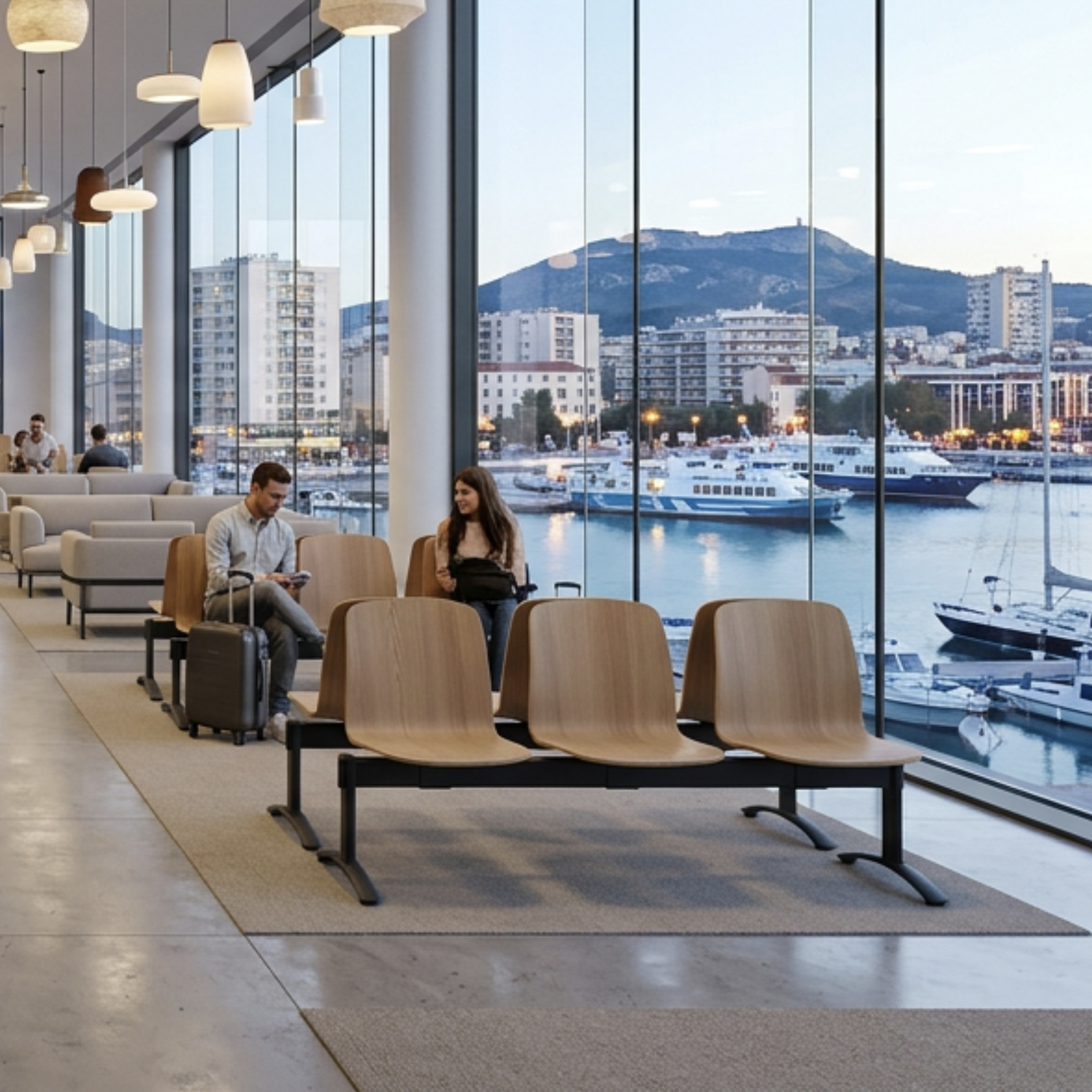VESPA la poutre d’attente qui apporte une touche naturelle à vos espaces d’attente, monocoque Bois, existe de 2 à 5 places, 4 pieds au choix